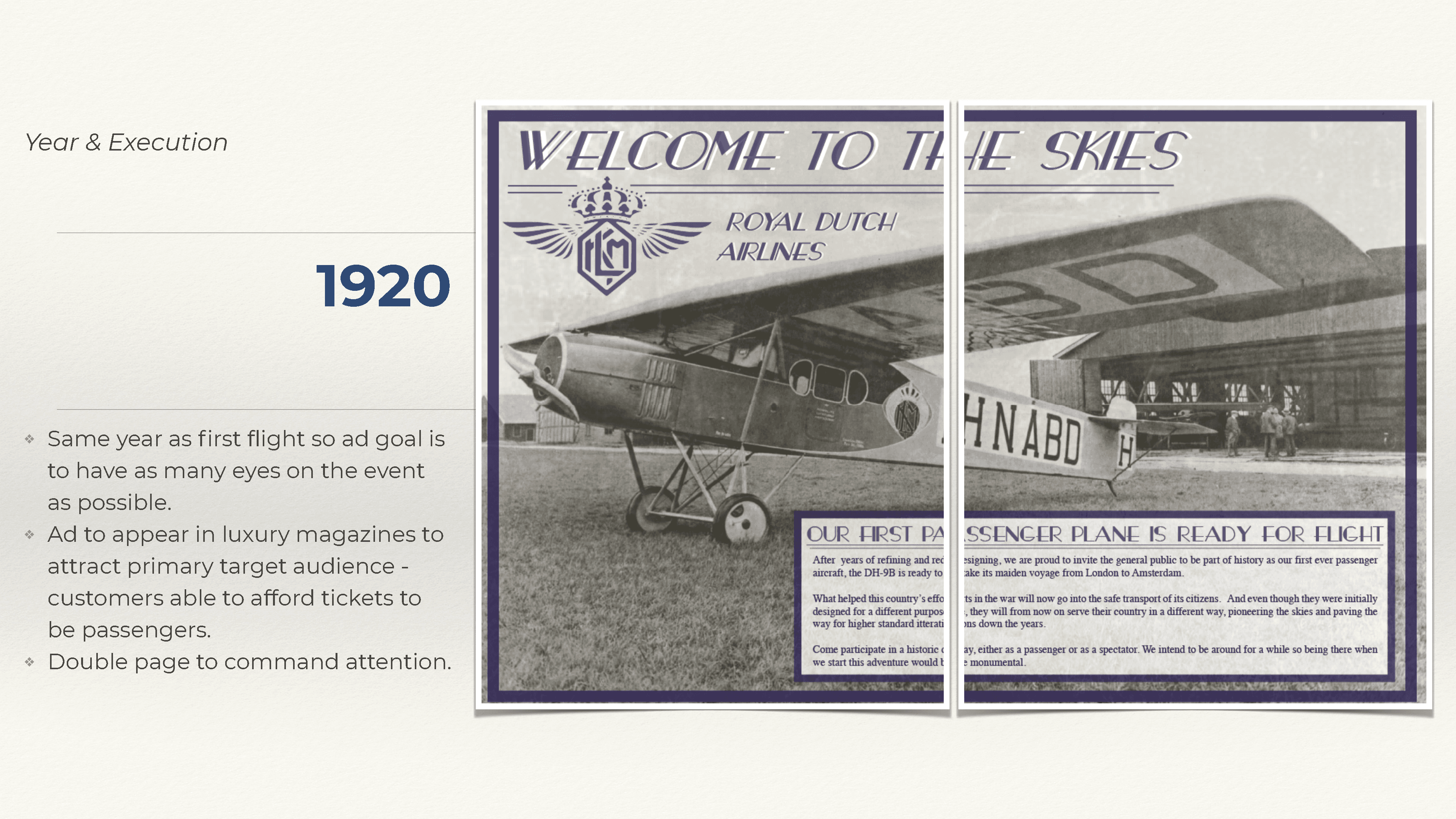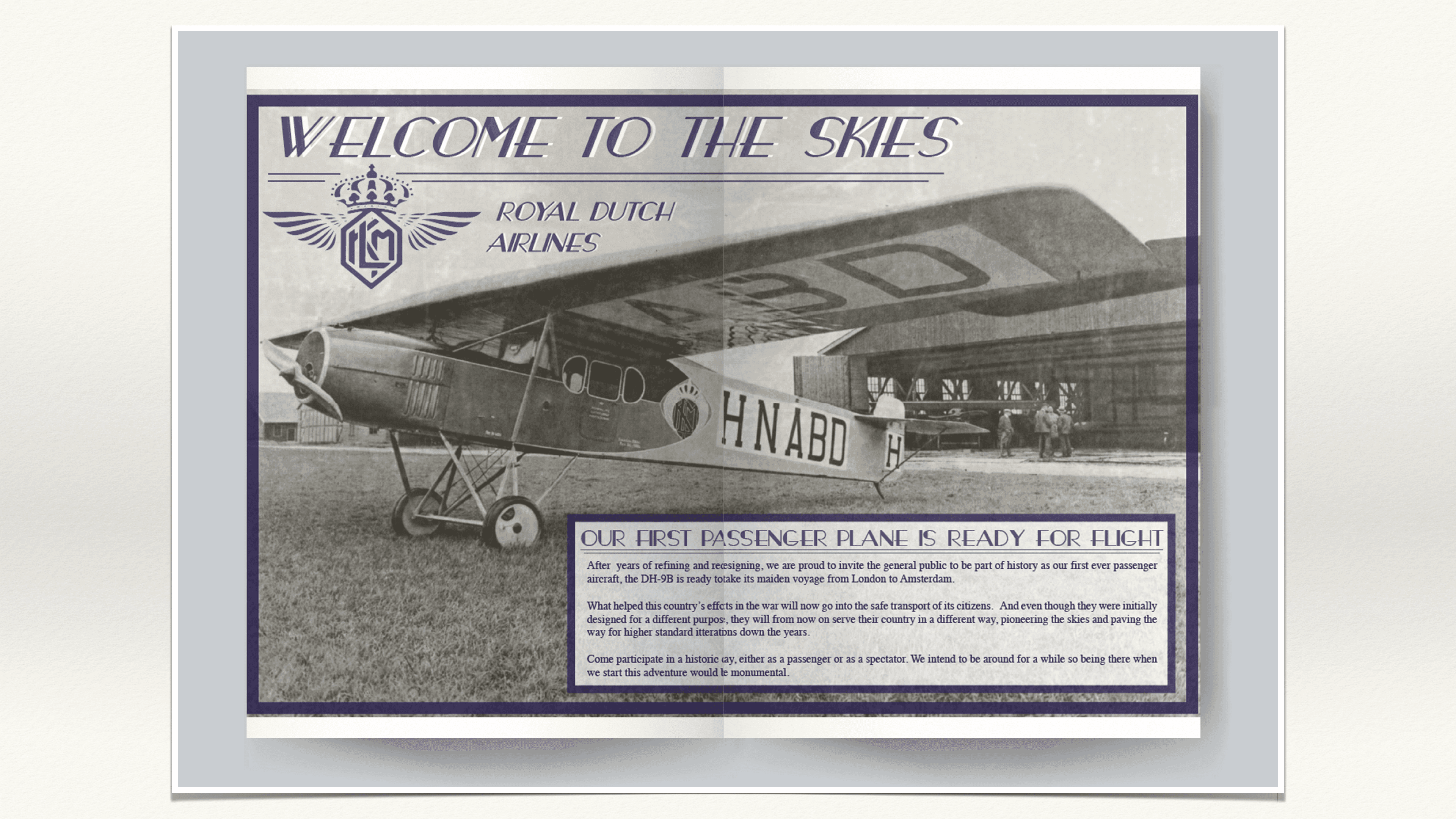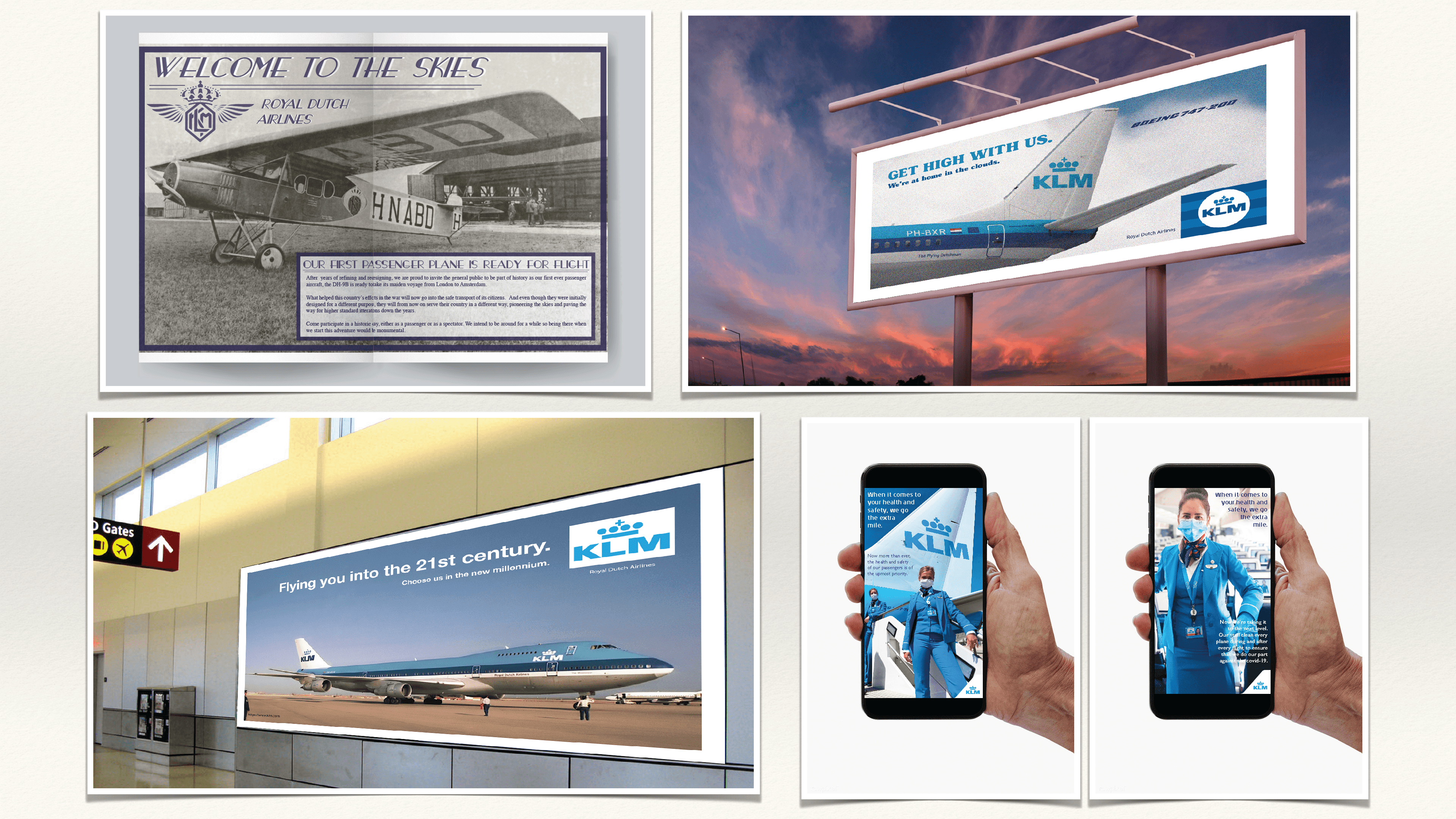 As part of a conceptual challenge, I was tasked with selecting an existing product or service and reimagining its advertising across four iconic time periods: 1920, 1970, 1999, and 2022. The assignment required not just creative execution, but historical awareness and an ability to adapt messaging across decades — all while maintaining brand consistency. I chose KLM Royal Dutch Airlines, a brand with a global presence and a long-standing legacy of travel, service, and innovation.