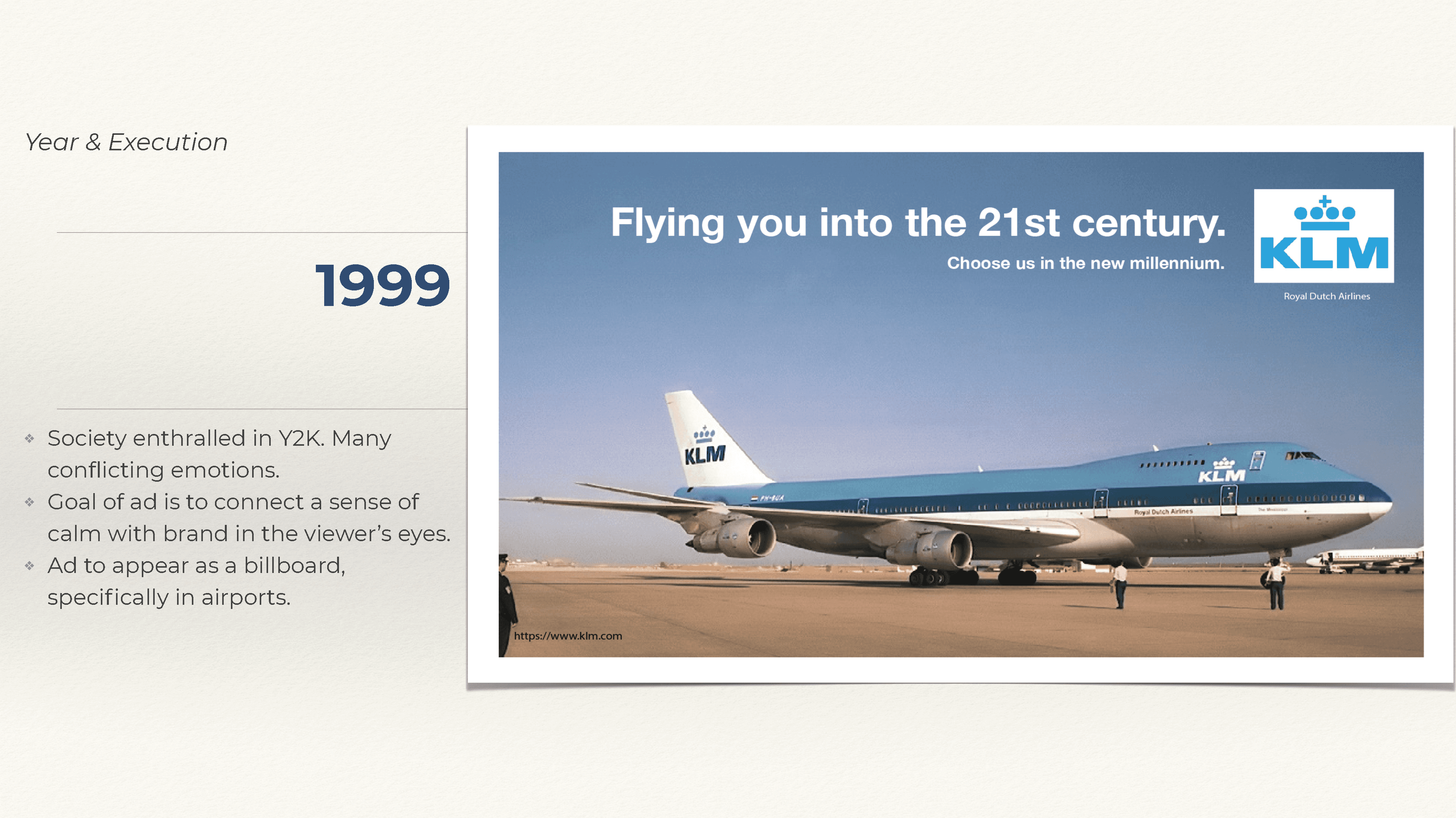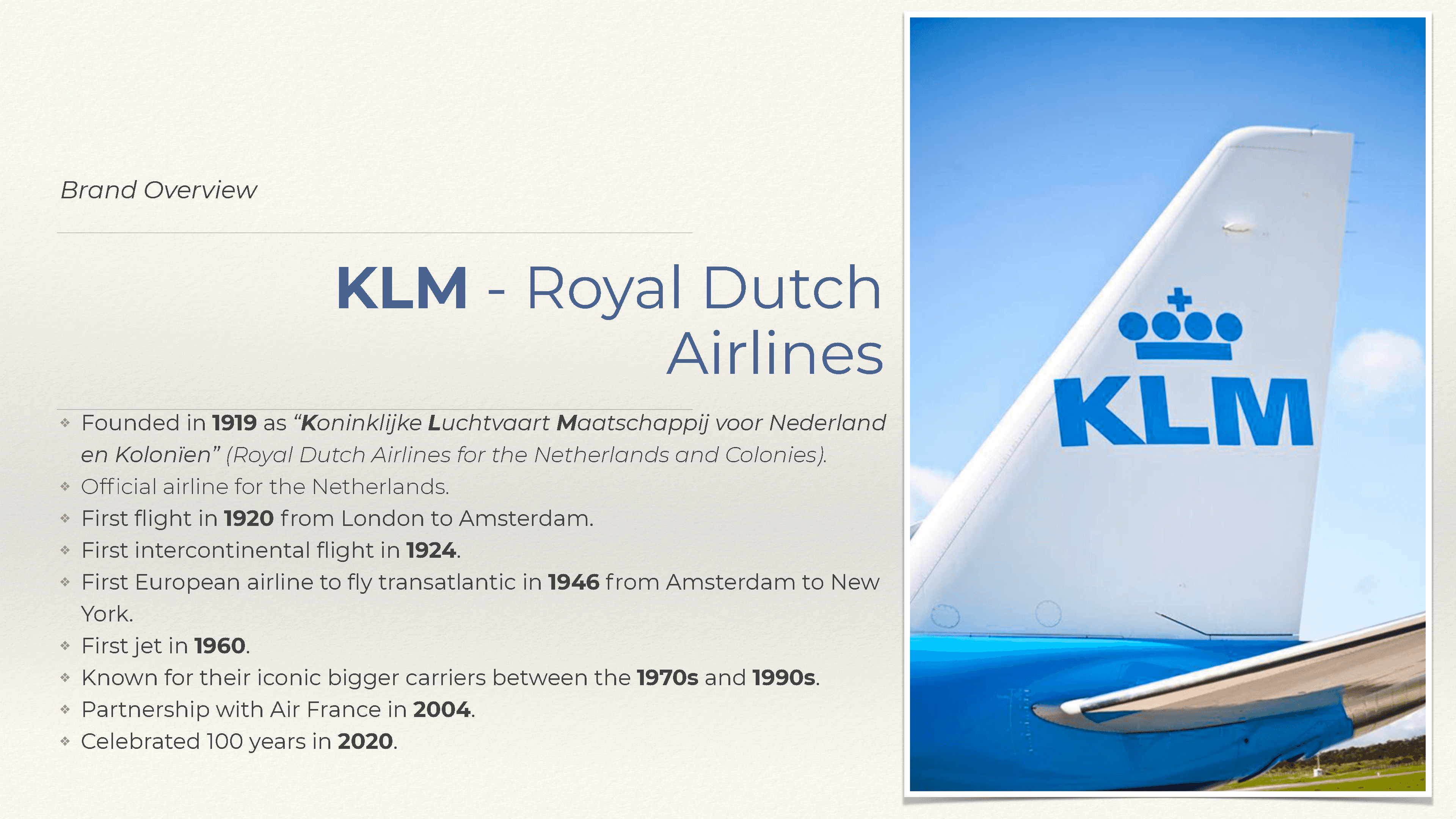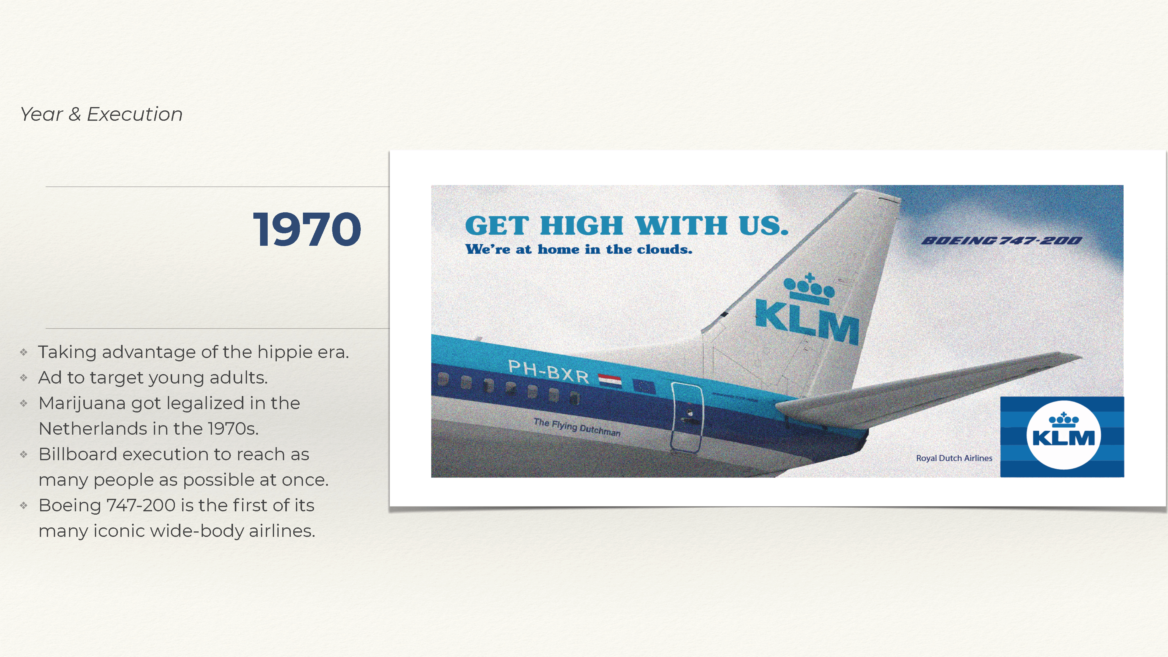 As part of a conceptual challenge, I was tasked with selecting an existing product or service and reimagining its advertising across four iconic time periods: 1920, 1970, 1999, and 2022. The assignment required not just creative execution, but historical awareness and an ability to adapt messaging across decades — all while maintaining brand consistency. I chose KLM Royal Dutch Airlines, a brand with a global presence and a long-standing legacy of travel, service, and innovation.